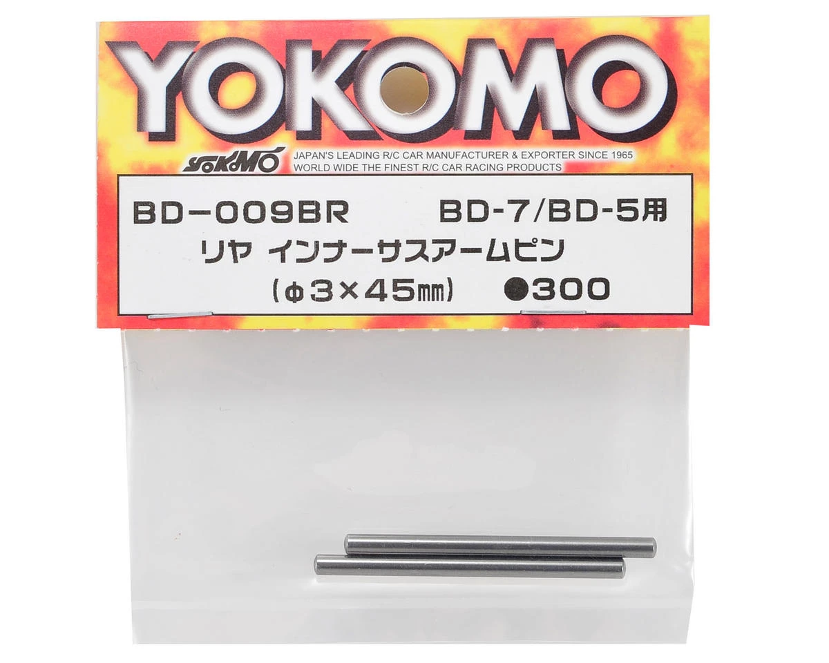 This is a pack of two replacement Yokomo 3x45mm Rear Inner Suspension Arm Pins, and are intended for use with the Yokomo BD7 1/10 scale touring car.Â