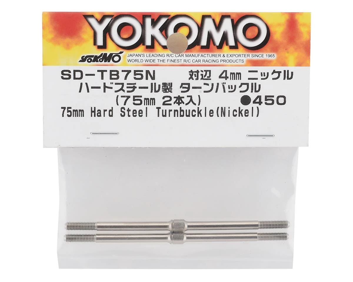 This is a pack of two replacement Yokomo 75mm Hard Steel Turnbuckles. These turnbuckles feature a nickel plating. These turnbuckles are used for the upper arms and tie rods.