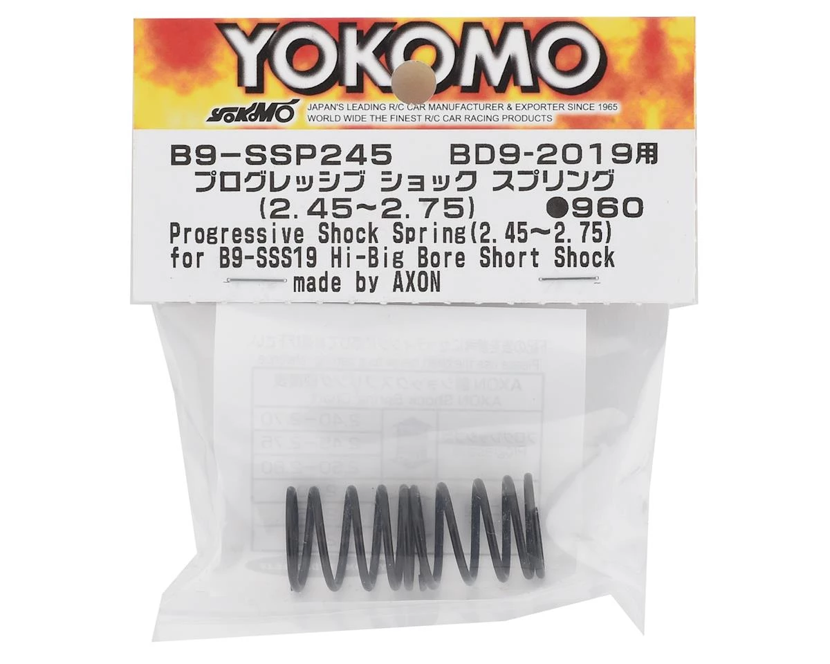 Yokomo BD9 Big Bore Short Shock Progressive Shock Springs were developed in collaboration with Axon. Package includes two 2.45 progressive rate springs.