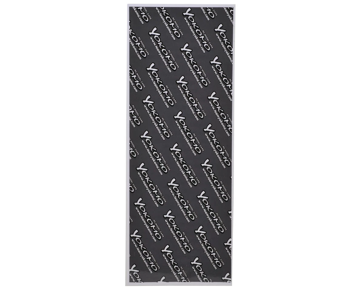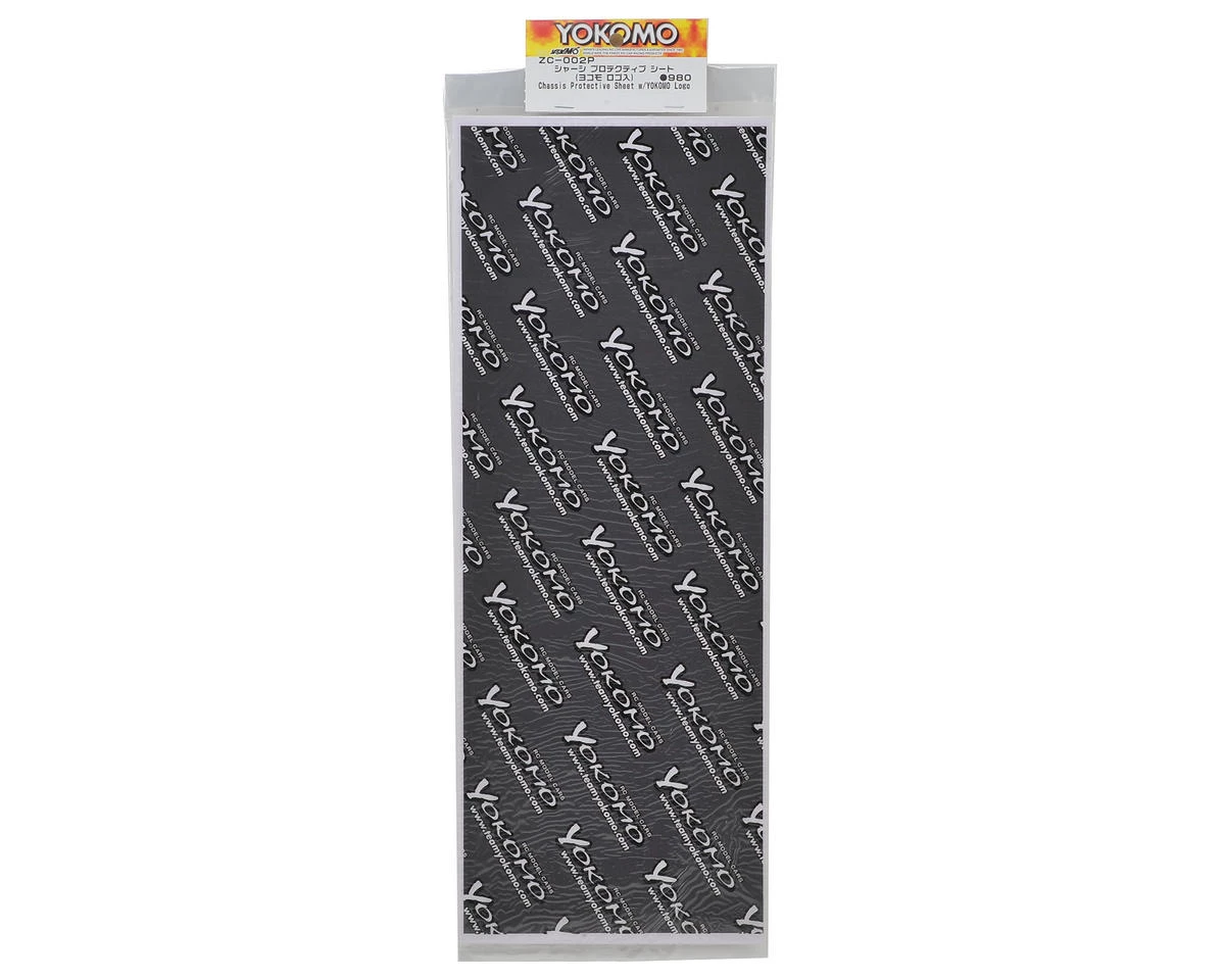 The Yokomo Chassis Protective Sheet is a cut to fit 15 3/4″ x 5 3/4″ sheet, with a black and white Yokomo graphic over a dark grey background that can be used in a variety of applications.