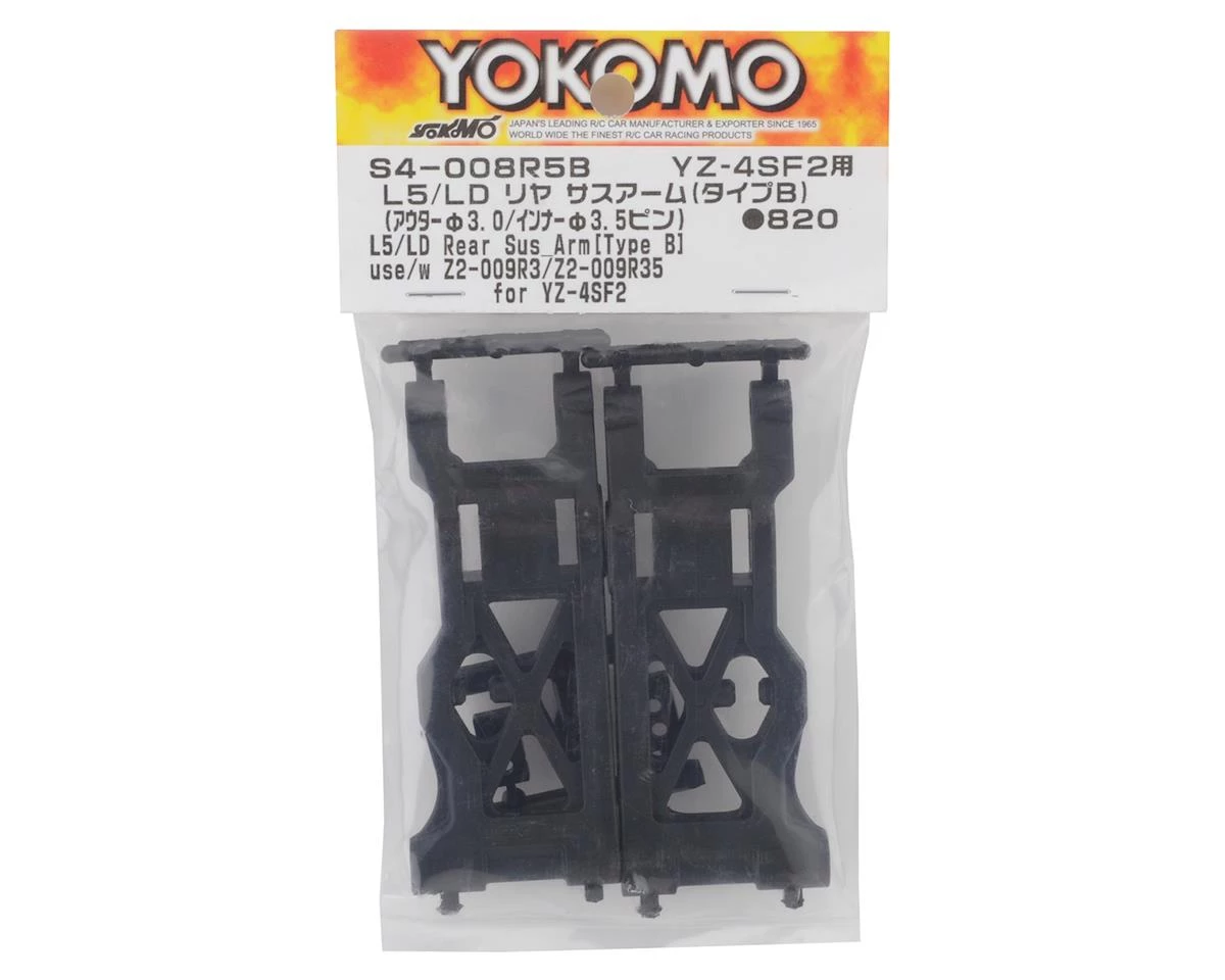 Yokomo YZ-4 SF2 L5/LD “Type B” Rear Suspension Arms. Package includes two replacement rear suspension arms with 3.5mm inner suspension holes, and 3.0mm outer suspension pin holes.Â